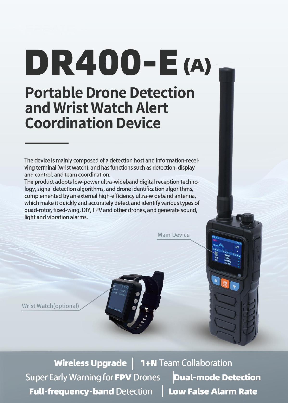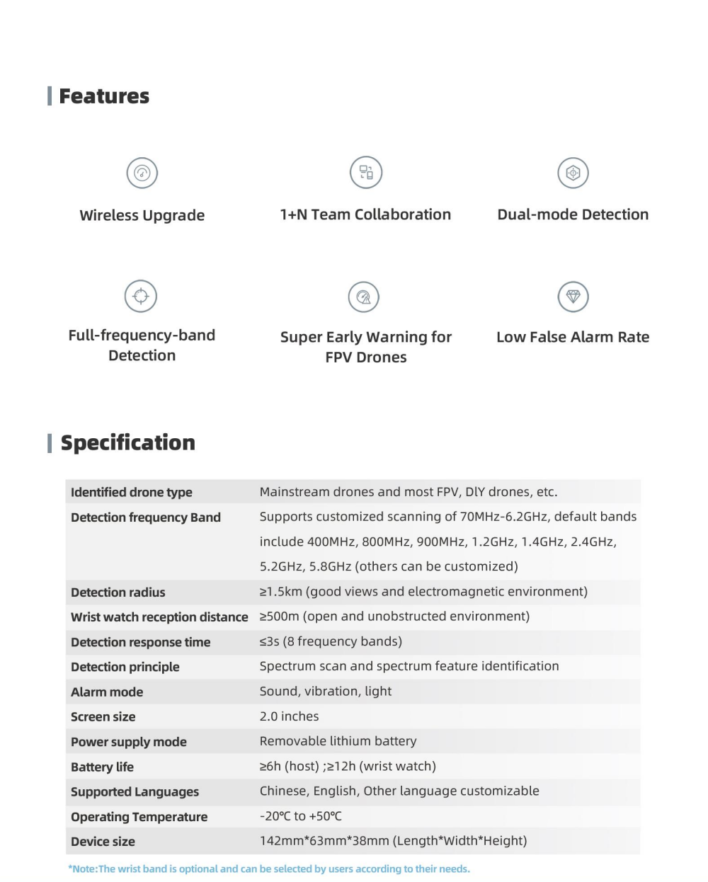2. Device OverviewThe portable drone detection device primarily consists of a detection host and a wristband information receiving terminal. It integrates spectrum sensing technology and offers reconnaissance, control display, and team coordination functions. The device can effectively detect and identify various types of drones and send alarm signals. It employs low-power, ultra-wideband digital reception technology, signal detection algorithms, and drone identification algorithms, paired with an external high-efficiency ultra-wideband antenna. In complex electromagnetic environments, it can accurately identify quadcopters, fixed-wing drones, DIY models, and FPVs, providing audible, visual, and vibration alerts.