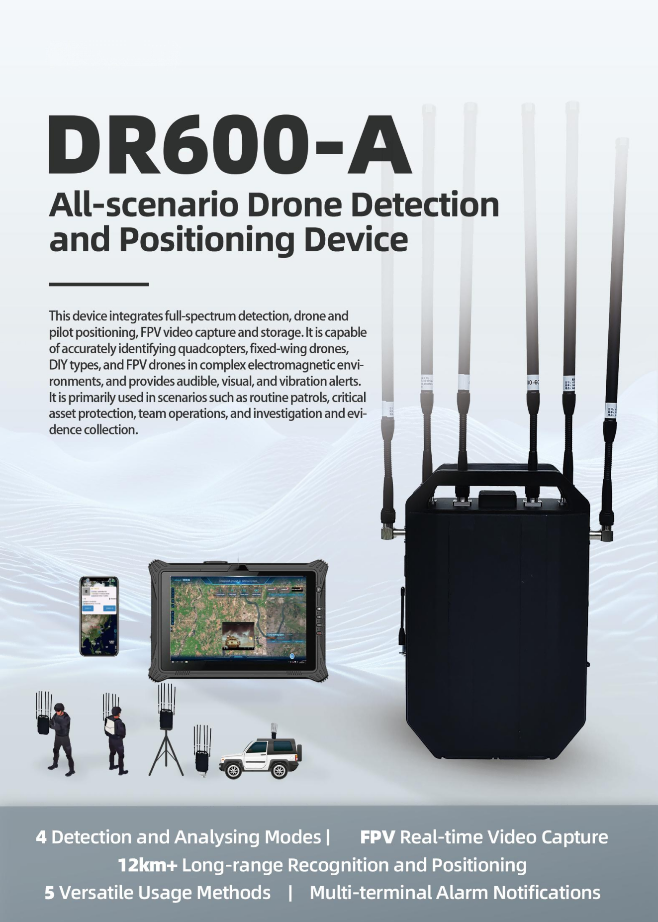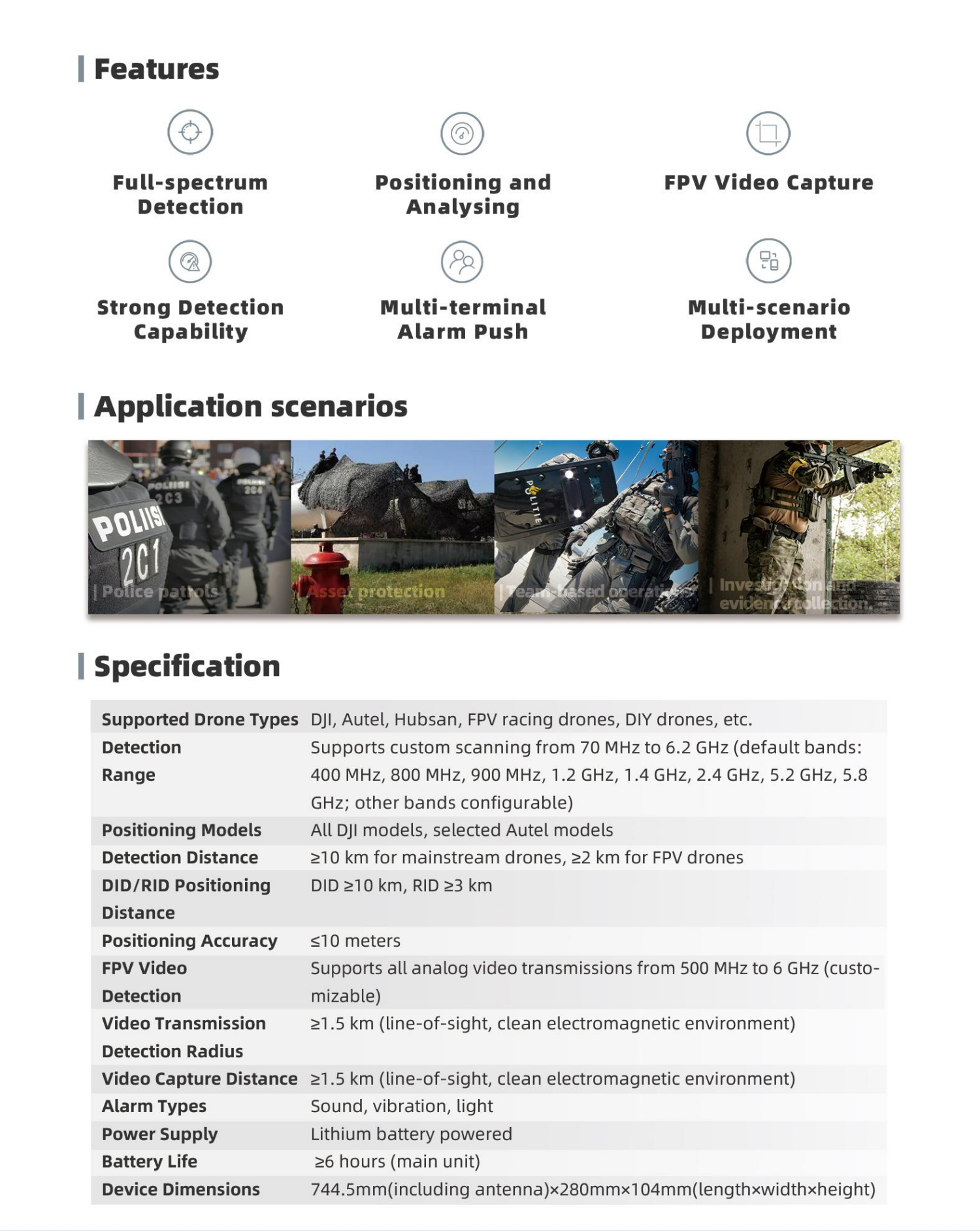 2. Device OverviewAll-scenario drone detection and positioning device integrates full-frequency detection, drone and pilot positioning, FPV video capture and storage. It is capable of accurately identifying quadcopters, fixed-wing drones, DIY drones, and FPV drones even in complex electromagnetic environments, and provides sound, light, and vibration alerts. It is mainly used for routine patrols, critical asset protection, team-based operations, and investigative evidence collection.