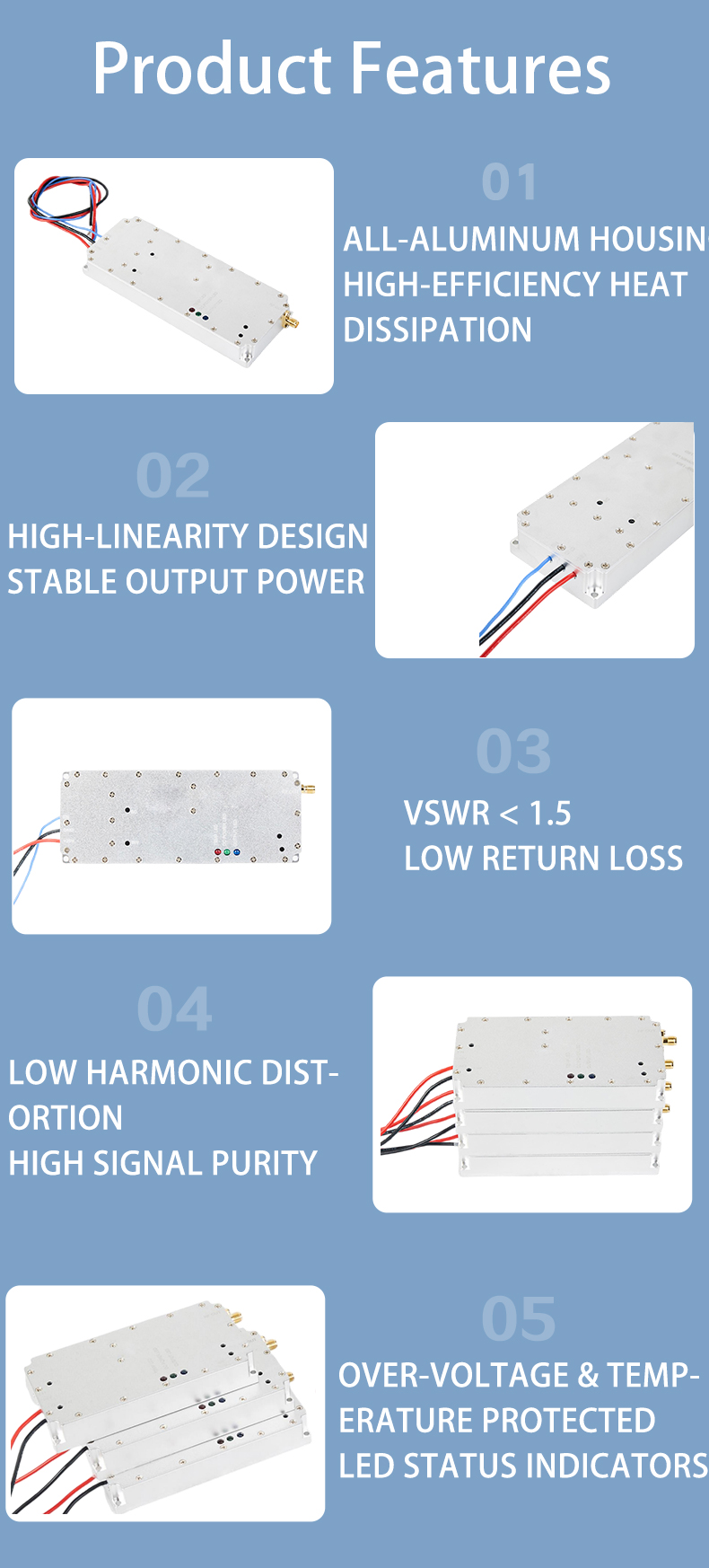 High-Power GaN AmplificationLeveraging GaN technology, this drone jammer achieves 50 W RF with superior efficiency and thermal stability,