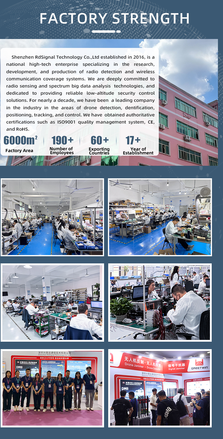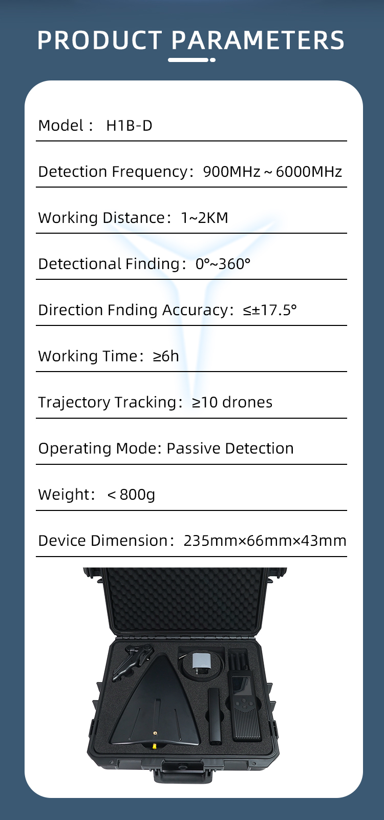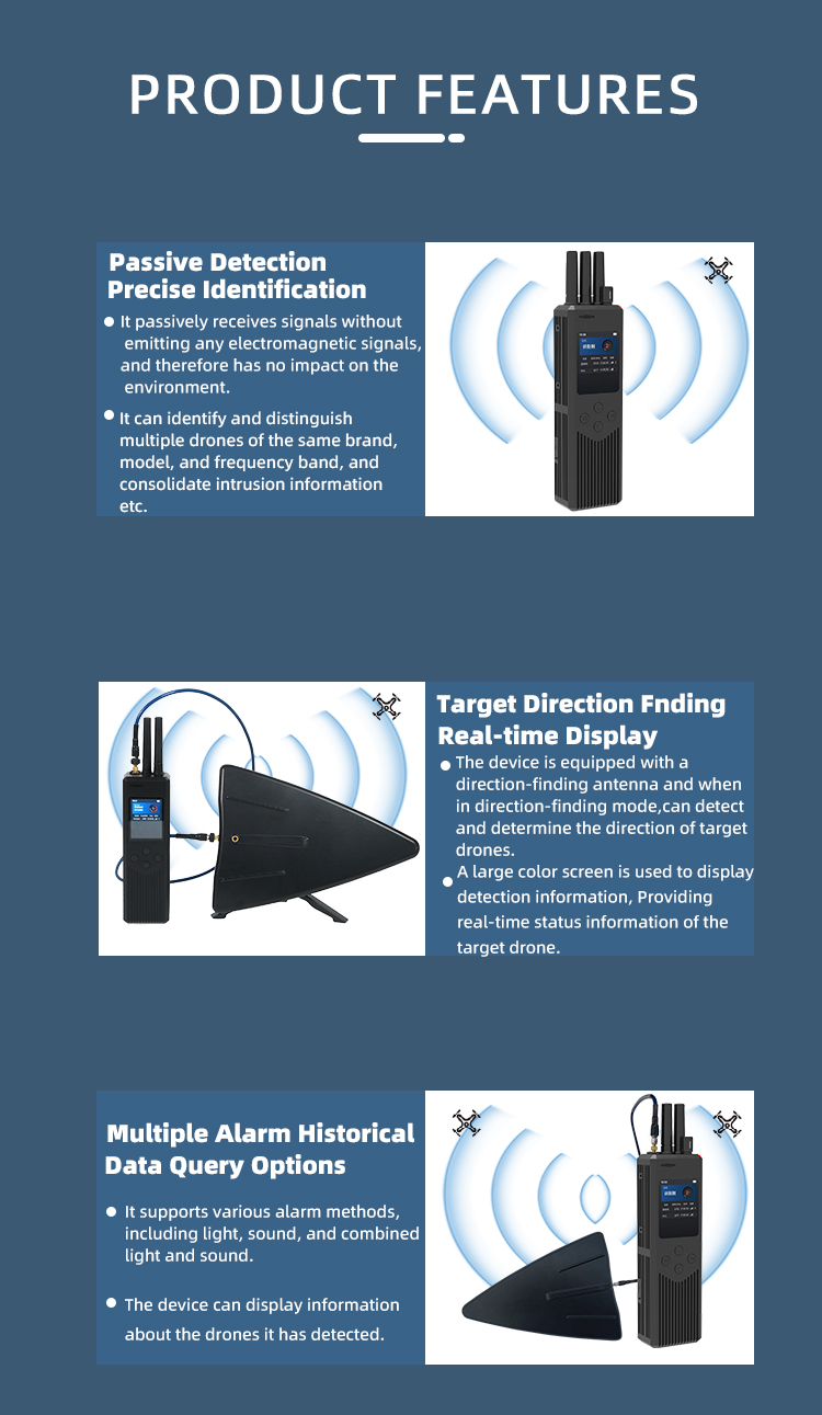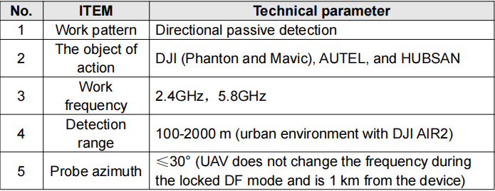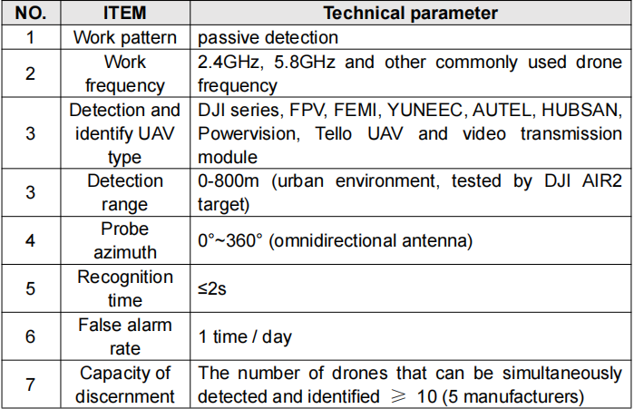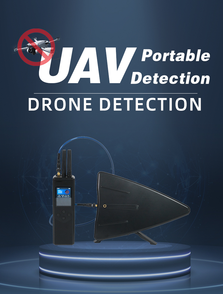 Handheld UAV detector, used for UAV detection, identification and direction finding. Based on spectrum perception and artificial intelligence technology, the remote control and video transmission of UAV are identified and classified. The equipment features include: direction finding of UAV; kinds of drone; long detection distance, low false alarm rate, screen display; small volume, light weight, handheld or working with jamming counter gun, suitable for patrol monitoring in office buildings, industrial park, border and coastal defense places.